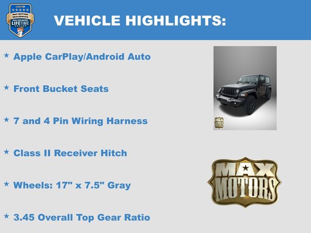 12.3" Touchscreen Display, 3.45 Overall Top Gear Ratio, 7 and 4 Pin Wiring Harness, Apple CarPlay/Android Auto, Auxiliary Switches, Class II Receiver Hitch, Front Bucket Seats, Jeep Trail Rated Kit, Quick Order Package 23B Sport, Trailer Tow and Auxiliary Switch Group, Wheels: 17" x 7.5" Gray.