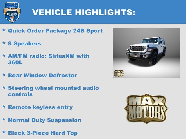 12.3" Touchscreen Display, 8 Speakers, AM/FM radio: SiriusXM with 360L, Apple CarPlay, Apple CarPlay/Android Auto, Black 3-Piece Hard Top, Brake assist, Cloth Low-Back Bucket Seats, Freedom Panel Storage Bag, Illuminated entry, MOPAR All-Weather Floor Mats, Normal Duty Suspension, Quick Order Package 24B Sport, Rear Window Defroster, Rear Window Wiper/Washer, Remote keyless entry, Steering wheel mounted audio controls.