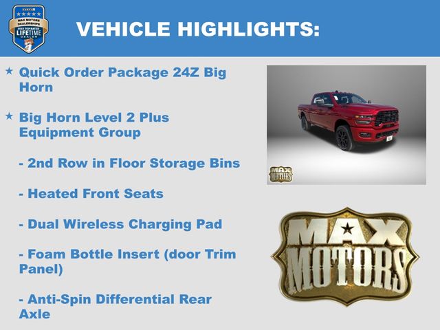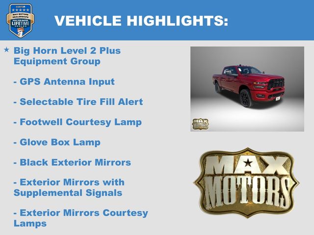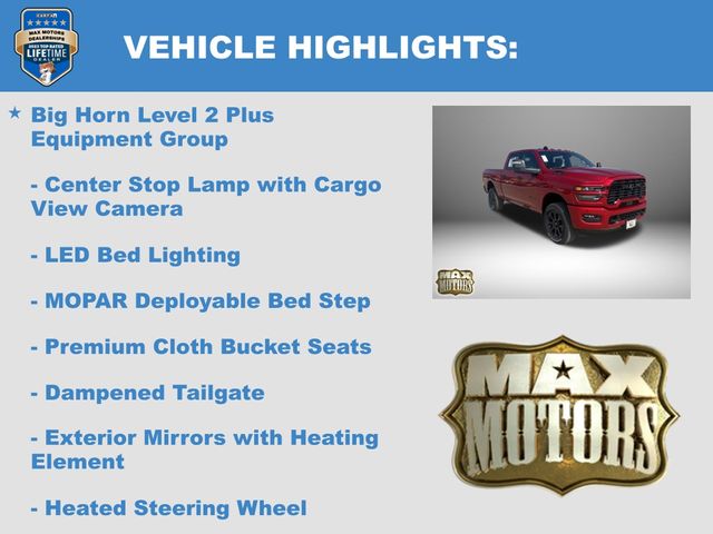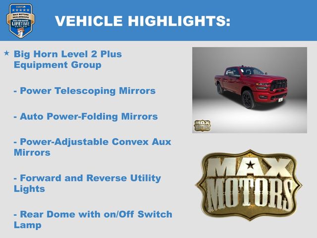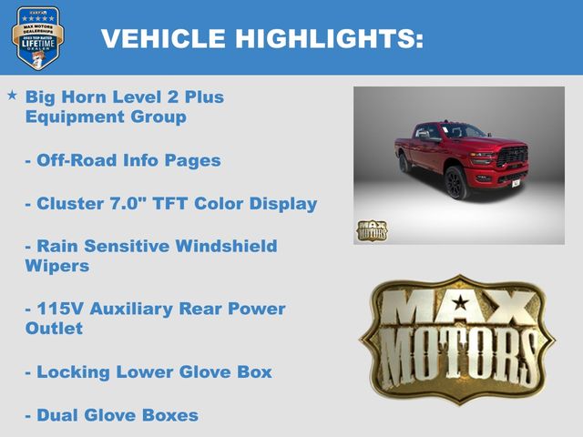 115V Auxiliary Rear Power Outlet, 12" Touchscreen Display, 2 Way Rear Headrest Seat, 4 Way Front Headrests, 400W Inverter, 4G LTE Wi-Fi Hot Spot, Active Lane Management System, Adaptive Steering System, Anti-Spin Differential Rear Axle, Apple CarPlay, Auto High Beam Headlamp Control, Auto Power-Folding Mirrors, Auto-Dimming Rear-View Mirror, Big Horn Level 2 Plus Equipment Group, Black Exterior Mirrors, Black Exterior Truck Badging, Black Interior Accents, Black Wheel Center Hub, Body Color Grille-Surround, Bucket Seats, Cluster 7.0" TFT Color Display, Cold Weather Group, Connectivity - US/Canada, Dampened Tailgate, Disassociated Touchscreen Display, Drowsy Driver Detection, Dual Glove Boxes, Dual Wireless Charging Pad, Emergency Vehicle Alert System (EVAS), Engine Block Heater, Exterior 115V AC Outlet, Exterior Mirrors Courtesy Lamps, Folding Flat Load Floor Storage, Footwell Courtesy Lamp, For Details, Visit DriveUconnect.com, For More Info, Call 800-643-2112, Front Seat Back Map Pockets, Full Length Upgraded Floor Console, Gloss Black Nostrils/Mic Black Grille, Glove Box Lamp, Google Android Auto, GPS Antenna Input, GPS Navigation, HD Radio, Heated Front Seats, Heated Steering Wheel, LED Bed Lighting, LED Tail Lamps, Locking Lower Glove Box, Luxury Steering Wheel, Manual Adjust 4-Way Front Passenger Seat, Mirror Running Lights, MOPAR Deployable Bed Step, MOPAR Winter Front Grille Cover, Night Edition, Off-Road Info Pages, Painted Front Bumper, Painted Rear Bumper, Power 2-Way Driver Lumbar Adjust, Power Adjust 8-Way Driver Seat, Power Adjust Mirrors, Power Adjustable Pedals, Power Heated Folding Telescopic Mirrors, Power Telescoping Mirrors, Power-Adjustable Convex Aux Mirrors, Premium Cloth Bucket Seats, Quick Order Package 24Z Big Horn, Rain Sensitive Windshield Wipers, Rear 60/40 Folding Seat, Rear Power Sliding Window, Red Tail Lamp Bezels, Remote Start System, Selectable Tire Fill Alert, SiriusXM Radio Service, Steering Wheel Mounted Audio Controls, Surround View Camera System, Traffic Sign Recognition, Trailer Reverse Guidance, Trailer Tire Pressure Monitoring System, Trailer Tow Pages, Universal Garage Door Opener, Wheels: 20" x 8.0" Black Painted Aluminum.
