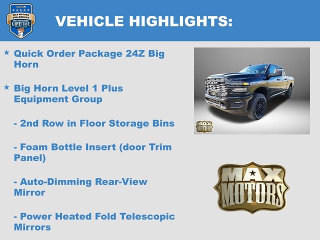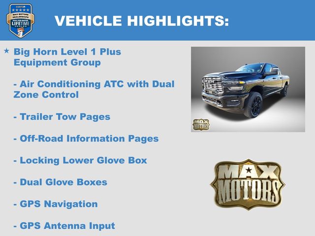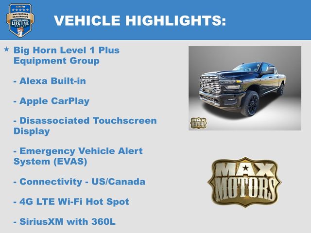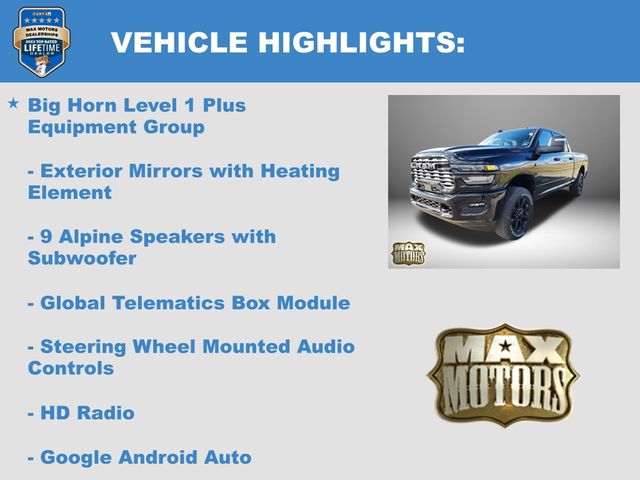 12" Touchscreen Display, 2 Way Rear Headrest Seat, 4 Way Front Headrests, 40/20/40 Split Bench Seat, 4G LTE Wi-Fi Hot Spot, Apple CarPlay, Auto Power-Folding Mirrors, Auto-Dimming Rear-View Mirror, Big Horn Level 1 Plus Equipment Group, Black Exterior Mirrors, Black Exterior Truck Badging, Black Interior Accents, Black Wheel Center Hub, Body Color Grille Surround, Cloth 40/20/40 Premium Bench Seat, Cold Weather Group, Connectivity - US/Canada, Disassociated Touchscreen Display, Dual Glove Boxes, Emergency Vehicle Alert System (EVAS), Engine Block Heater, Exterior Mirrors Courtesy Lamps, Folding Flat Load Floor Storage, Footwell Courtesy Lamp, For Details Visit DriveUconnect.com, For More Info, Call 800-643-2112, Front Center Seat Cushion Storage, Front Seat Back Map Pockets, Gloss Black Nostrils/Molded in Color Black Grille, Glove Box Lamp, Google Android Auto, GPS Antenna Input, GPS Navigation, HD Radio, LED Bed Lighting, Locking Lower Glove Box, Luxury Steering Wheel, Manual Adjust 4-Way Front Passenger Seat, Mirror Running Lights, MOPAR Deployable Bed Step, MOPAR Winter Front Grille Cover, Night Edition, Off-Road Information Pages, Painted Front Bumper, Painted Rear Bumper, Power 2-Way Driver Lumbar Adjust, Power Adjust 8-Way Driver Seat, Power Adjust Mirrors, Power Heated Fold Telescopic Mirrors, Power Telescoping Mirrors, Power-Adjustable Convex Aux Mirrors, Quick Order Package 24Z Big Horn, Rear 60/40 Folding Seat, Remote Start System, Remote USB Port - Charge Only, Selectable Tire Fill Alert, SiriusXM Radio Service, Steering Wheel Mounted Audio Controls, Storage Tray, Trailer Tow Pages, Wheels: 20" x 8.0" Black Painted Aluminum.