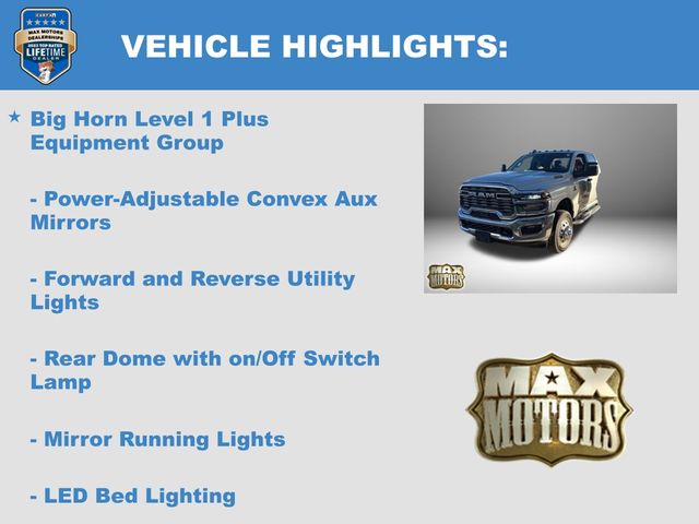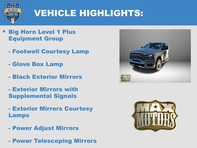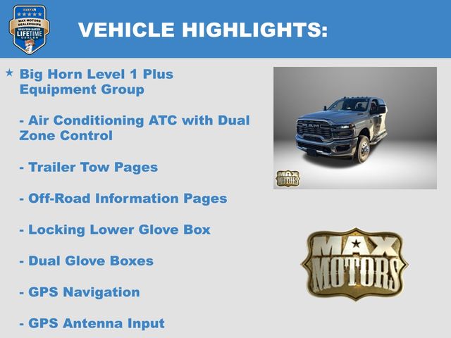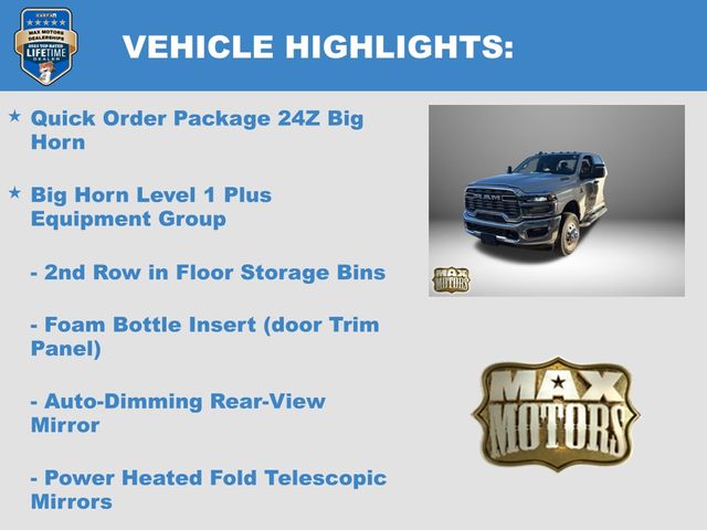 12" Touchscreen Display, 2 Way Rear Headrest Seat, 2nd Row in Floor Storage Bins, 4 Way Front Headrests, 40/20/40 Split Bench Seat, 4G LTE Wi-Fi Hot Spot, 50 Gallon Fuel Tank, 5th Wheel/Gooseneck Towing Prep Group, 6000# Front Axle with Hub Extension, 9 Alpine Speakers with Subwoofer, Air Conditioning ATC with Dual Zone Control, Alexa Built-in, Apple CarPlay/Android Auto, Auto Power-Folding Mirrors, Auto-Dimming Rear-View Mirror, Big Horn Level 1 Plus Equipment Group, Black Exterior Mirrors, Box and Rear Fender Clearance Lamps, Center Hub, Clearance Lamps, Cloth 40/20/40 Premium Bench Seat, Cold Weather Group, Connected Travel and Traffic Services, Connectivity - US/Canada, Disassociated Touchscreen Display, Dual Glove Boxes, Dual Rear Wheels, Emergency Vehicle Alert System (EVAS), Engine Block Heater, Exterior Mirrors Courtesy Lamps, Exterior Mirrors with Heating Element, Exterior Mirrors with Supplemental Signals, Foam Bottle Insert (door Trim Panel), Folding Flat Load Floor Storage, Footwell Courtesy Lamp, For Details Visit DriveUconnect.com, For More Info, Call 800-643-2112, Forward and Reverse Utility Lights, Front Armrest with Cupholders, Front Center Seat Cushion Storage, Front Seat Back Map Pockets, Global Telematics Box Module, Glove Box Lamp, Google Android Auto, GPS Antenna Input, GPS Navigation, HD Radio, Integrated Voice Command with Bluetooth, LED Bed Lighting, Locking Lower Glove Box, Luxury Steering Wheel, Manual Adjust 4-Way Front Passenger Seat, Max Tow Package, Mirror Running Lights, MOPAR Deployable Bed Step, MOPAR Spray in Bedliner, MOPAR Winter Front Grille Cover, Nexen Brand Tires, Off-Road Information Pages, Power 2-Way Driver Lumbar Adjust, Power Adjust 8-Way Driver Seat, Power Adjust Mirrors, Power Heated Fold Telescopic Mirrors, Power Telescoping Mirrors, Power-Adjustable Convex Aux Mirrors, Quick Order Package 24Z Big Horn, Radio: Uconnect 5 Navigation with 12.0" Display, Rear 60/40 Folding Seat, Rear Dome with on/Off Switch Lamp, Rear Wheelhouse Liners, Remote Start System, Remote USB Port - Charge Only, Selectable Tire Fill Alert, SiriusXM Radio Service, SiriusXM with 360L, Steering Wheel Mounted Audio Controls, Storage Tray, Trailer Tow Pages, Wheels: 17" x 6.0" Polished Aluminum.