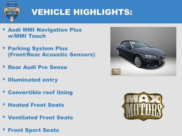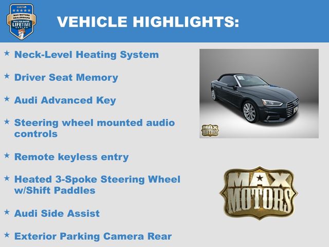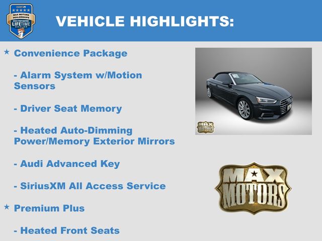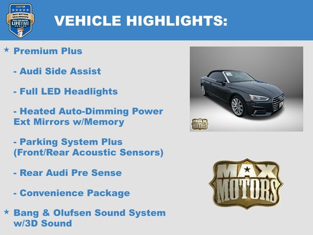 quattro, Black w/Leather Seating Surfaces, 12.3" LCD Display Audi Virtual Cockpit, Alarm System w/Motion Sensors, Audi Advanced Key, Audi MMI Navigation Plus w/MMI Touch, Audi Side Assist, Bang & Olufsen Sound System w/3D Sound, Convenience Package, Convertible roof lining, Driver Seat Memory, Exterior Parking Camera Rear, Front Sport Seats, Full LED Headlights, Heated 3-Spoke Steering Wheel w/Shift Paddles, Heated Auto-Dimming Power Ext Mirrors w/Memory, Heated Auto-Dimming Power/Memory Exterior Mirrors, Heated Front Seats, High intensity discharge headlights: Xenon plus, Illuminated entry, Luxury Package, Navigation Package, Neck-Level Heating System, Parking System Plus (Front/Rear Acoustic Sensors), Premium Plus, Rear Audi Pre Sense, Remote keyless entry, SiriusXM All Access Service, Steering wheel mounted audio controls, Variably intermittent wipers, Ventilated Front Seats, Wheels: 18" x 8.5" 10-Spoke-Dynamic-Design.