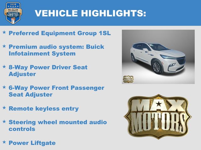 FWD, 18" Aluminum Wheels, 1st & 2nd Row All-Weather Floor Liners (LPO), 3rd Row All-Weather Floor Liner (LPO), 3rd row seats: split-bench, 6-Way Power Front Passenger Seat Adjuster, 7-Passenger Seating, 8-Way Power Driver Seat Adjuster, Front & Rear Park Assist, Front Bucket Seats, Fully automatic headlights, Heated Driver & Front Passenger Seats, Heated Steering Wheel, Illuminated entry, Power Driver Lumbar Control Seat Adjuster, Power Liftgate, Power Passenger Lumbar Control Seat Adjuster, Preferred Equipment Group 1SL, Premium audio system: Buick Infotainment System, Remote keyless entry, Speed control, Steering wheel mounted audio controls, Variably intermittent wipers, Wireless Apple CarPlay/Wireless Android Auto.