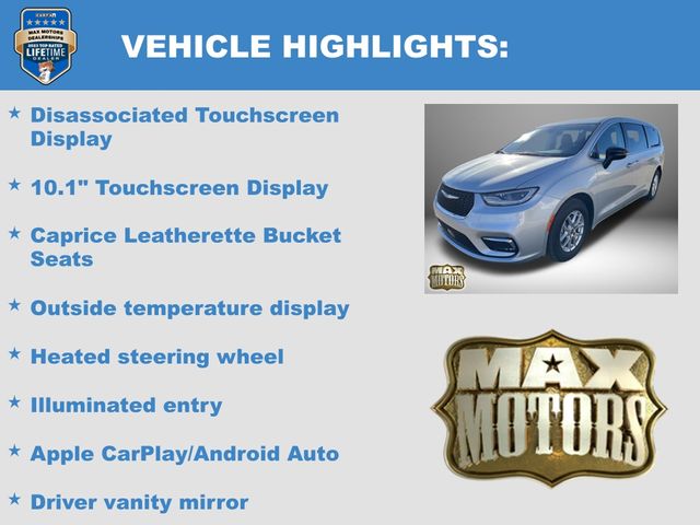 10.1" Touchscreen Display, 3rd row seats: split-bench, 6 Speakers, Apple CarPlay/Android Auto, Black Seats, Bumpers: body-color, Caprice Leatherette Bucket Seats, Disassociated Touchscreen Display, Driver door bin, Driver vanity mirror, Driver's Seat Mounted Armrest, Front Bucket Seats, Front fog lights, Front reading lights, Google Android Auto, Heated door mirrors, Heated front seats, Heated steering wheel, Illuminated entry, Integrated Active Noise Cancellation, Memory seat, Outside temperature display, Overhead console, ParkView Rear Back-Up Camera, Power door mirrors, Power driver seat, Power Liftgate, Quick Order Package 27L, Radio: Uconnect 5 w/10.1" Display, Reclining 3rd row seat, Remote keyless entry, Split folding rear seat, Steering wheel mounted audio controls, Touring Suspension.