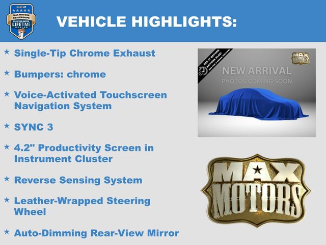 10-Way Power Driver & Passenger Seats, 2-Bar Style Grille w/Chrome 2 Minor Bars, 4.2" Productivity Screen in Instrument Cluster, Auto-Dimming Rear-View Mirror, Bumpers: chrome, Chrome Door & Tailgate Handles w/Body-Color Bezel, Chrome Step Bars, Class IV Trailer Hitch Receiver, Cloth 40/20/40 Front Seat, Driver door bin, Equipment Group 302A Luxury, Exterior Parking Camera Rear, Fixed Backlight w/Privacy Glass, Front reading lights, Fully automatic headlights, Heated Front Seats, Illuminated entry, Leather-Wrapped Steering Wheel, Power Glass Heated Sideview Mirrors, Power steering, Power-Adjustable Pedals, Radio: Single-CD/SiriusXM w/7 Speakers, Rear Under-Seat Storage, Rear Window Defroster, Remote keyless entry, Remote Start System, Reverse Sensing System, Single-Tip Chrome Exhaust, Steering wheel mounted audio controls, SYNC, SYNC 3, Telescoping steering wheel, Voice-Activated Touchscreen Navigation System, Wheels: 18" Chrome-Like PVD, XLT Chrome Appearance Package.