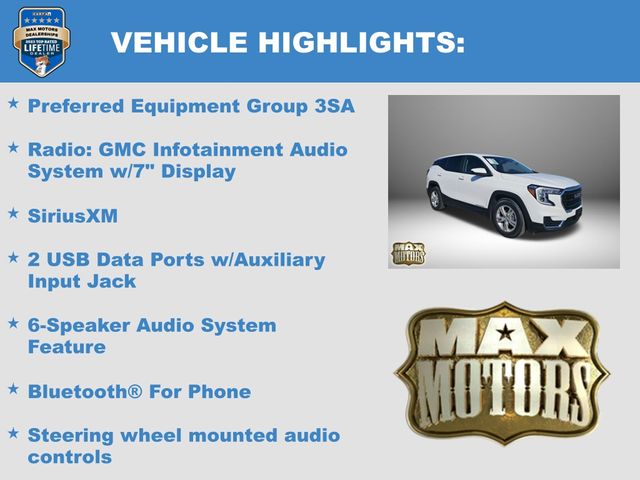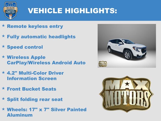 2 USB Data Ports w/Auxiliary Input Jack, 4.2" Multi-Color Driver Information Screen, 6-Speaker Audio System Feature, Bluetooth® For Phone, Front Bucket Seats, Fully automatic headlights, Preferred Equipment Group 3SA, Radio: GMC Infotainment Audio System w/7" Display, Remote keyless entry, SiriusXM, Speed control, Split folding rear seat, Steering wheel mounted audio controls, Variably intermittent wipers, Wheels: 17" x 7" Silver Painted Aluminum, Wireless Apple CarPlay/Wireless Android Auto.