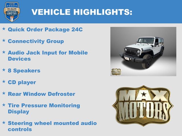 16" x 7.0" Luxury Styled Steel Wheels, 3.21 Rear Axle Ratio, 8 Speakers, Audio Jack Input for Mobile Devices, Black 3-Piece Hard Top, Brake assist, CD player, Cloth Seats w/Adjustable Head Restraints, Connectivity Group, Driver Height Adjuster Seat, Freedom Panel Storage Bag, Front Bucket Seats, Front Center Armrest w/Storage, Front fog lights, Normal Duty Suspension, Passenger door bin, Quick Order Package 24C, Rear Window Defroster, Rear Window Wiper/Washer, Split folding rear seat, Steering wheel mounted audio controls, Tachometer, Tilt steering wheel, Tire Pressure Monitoring Display, Traction control, Trip computer, Uconnect Voice Command w/Bluetooth, Vehicle Information Center.