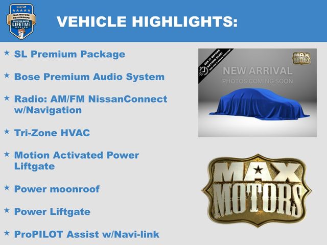 AWD, 19" Aluminum Alloy Wheels, Bose Premium Audio System, Front, Side & Rear Sonar, Heated Front Bucket Seats, Motion Activated Power Liftgate, Power Liftgate, Power moonroof, ProPILOT Assist w/Navi-link, Radio: AM/FM NissanConnect w/Navigation, Rear Door Sunshades, SL Premium Package, Traffic Sign Recognition, Tri-Zone HVAC.