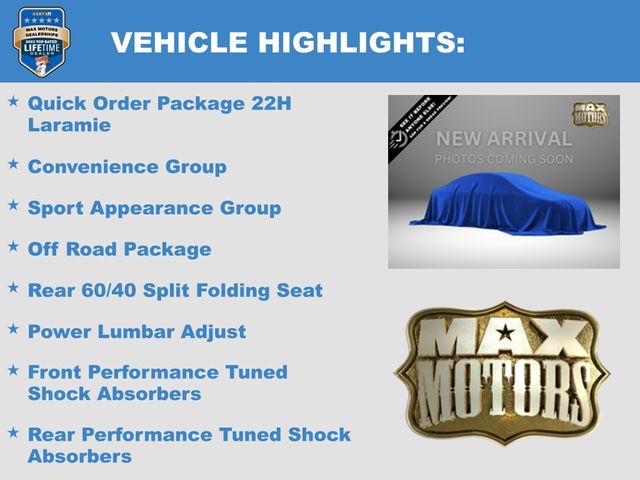 #1 Seat Foam Cushion, 40/20/40 Split Bench Seat, Anti-Spin Differential Rear Axle, Auto High Beam Headlamp Control, Bi-Function Black Projector Headlamp, Black Painted Exterior Mirrors, Black Power Fold-Away Mirrors, Black Premium Tail Lamp, Body Color Door Handles, Body-Color Grille w/RAM, Convenience Group, Folding Flat Load Floor Storage, Front Armrest w/Cupholders, Front Center Seat Cushion Storage, Front Performance Tuned Shock Absorbers, Heated Front Seats, High Back Seats, Highline Door Trim Panel, Instrument Panel Premium Bezel, Leather Trim Sport Front Bench Seat, Off Road Package, Offroad Decal, Painted Front Bumper, Painted Rear Bumper, Power Lumbar Adjust, Quick Order Package 22H Laramie, Rain Sensitive Windshield Wipers, Rear 60/40 Split Folding Seat, Rear Performance Tuned Shock Absorbers, Sport Appearance Group, Storage Tray, Tow Hooks, Ventilated Front Seats.