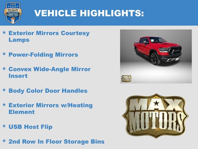 115V Auxiliary Rear Power Outlet, 2-Door Passive Entry, Front Door Locks, 2nd Row In Floor Storage Bins, 4G LTE Wi-Fi Hot Spot, 8.4" Touchscreen Display, Air Conditioning ATC w/Dual Zone Control, Apple CarPlay, Auto-Dimming Exterior Driver Mirror, Black Exterior Mirrors, Black Premium Power Mirrors, Bluetooth Handsfree Phone & Audio, Body Color Door Handles, Comfort/Convenience Group, Connectivity - US/Canada, Convex Wide-Angle Mirror Insert, Driver Seat Memory, Exterior Mirrors Courtesy Lamps, Exterior Mirrors w/Heating Element, Exterior Mirrors w/Memory, Exterior Mirrors w/Supplemental Signals, Foam Bottle Insert (Door Trim Panel), For Details, Visit DriveUconnect.com, Global Telematics Box Module (TBM), Google Android Auto, GPS Antenna Input, Heated Front Seats, Heated Second Row Seats, Heated Steering Wheel, Integrated Center Stack Radio, Media Hub w/2 Charge Only USBs, ParkSense Front/Rear Park Assist w/Stop, Power 2-Way Passenger Lumbar Adjust, Power 8-Way Driver & Passenger Seats, Power Adjustable Pedals, Power-Folding Mirrors, Quick Order Package 25W Rebel, Radio: Uconnect 5 W w/8.4" Display, Rain Sensitive Windshield Wipers, Rear Dome w/On/Off Switch Lamp, Rear Window Defroster, Rebel Level 2 Equipment Group, Remote Start System, Remote Tailgate Release, Security Alarm, SiriusXM Radio Service, SiriusXM Satellite Radio, Sun Visors w/Illuminated Vanity Mirrors, Universal Garage Door Opener, USB Host Flip, Wireless Charging Pad.