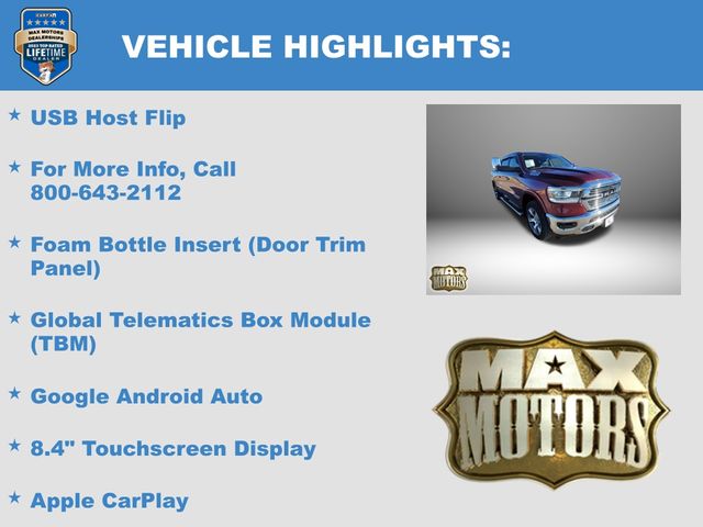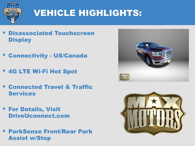 4G LTE Wi-Fi Hot Spot, 8.4" Touchscreen Display, All R1 High Radios, All Radio Equipped Vehicles, Alloy wheels, Apple CarPlay, Auto High Beam Headlamp Control, Connected Travel & Traffic Services, Connectivity - US/Canada, Disassociated Touchscreen Display, Foam Bottle Insert (Door Trim Panel), For Details, Visit DriveUconnect.com, For More Info, Call 800-643-2112, Global Telematics Box Module (TBM), Google Android Auto, GPS Antenna Input, GPS Navigation, harman/kardon 19 Speaker Premium Sound, HD Radio, Heated Second Row Seats, Integrated Center Stack Radio, Integrated Voice Command w/Bluetooth, Laramie Level B Equipment Group (DISC), ParkSense Front/Rear Park Assist w/Stop, Quick Order Package 27H Laramie, Radio: Uconnect 5 Nav w/8.4" Display, Rain Sensitive Windshield Wipers, Rear 60/40 Folding Split Recline Seat, Rear Underseat Compartment Storage, Remote Tailgate Release, SiriusXM Radio Service, SiriusXM w/360L, Trailer Brake Control, Trailer Light Check, Trailer Reverse Steering Control, Trailer Tire Pressure Monitoring System, Trailer Tow Group, USB Host Flip.