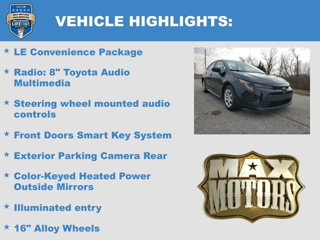 16" Alloy Wheels, Color-Keyed Heated Power Outside Mirrors, Exterior Parking Camera Rear, Front Doors Smart Key System, Illuminated entry, LE Convenience Package, Radio: 8" Toyota Audio Multimedia, Steering wheel mounted audio controls.